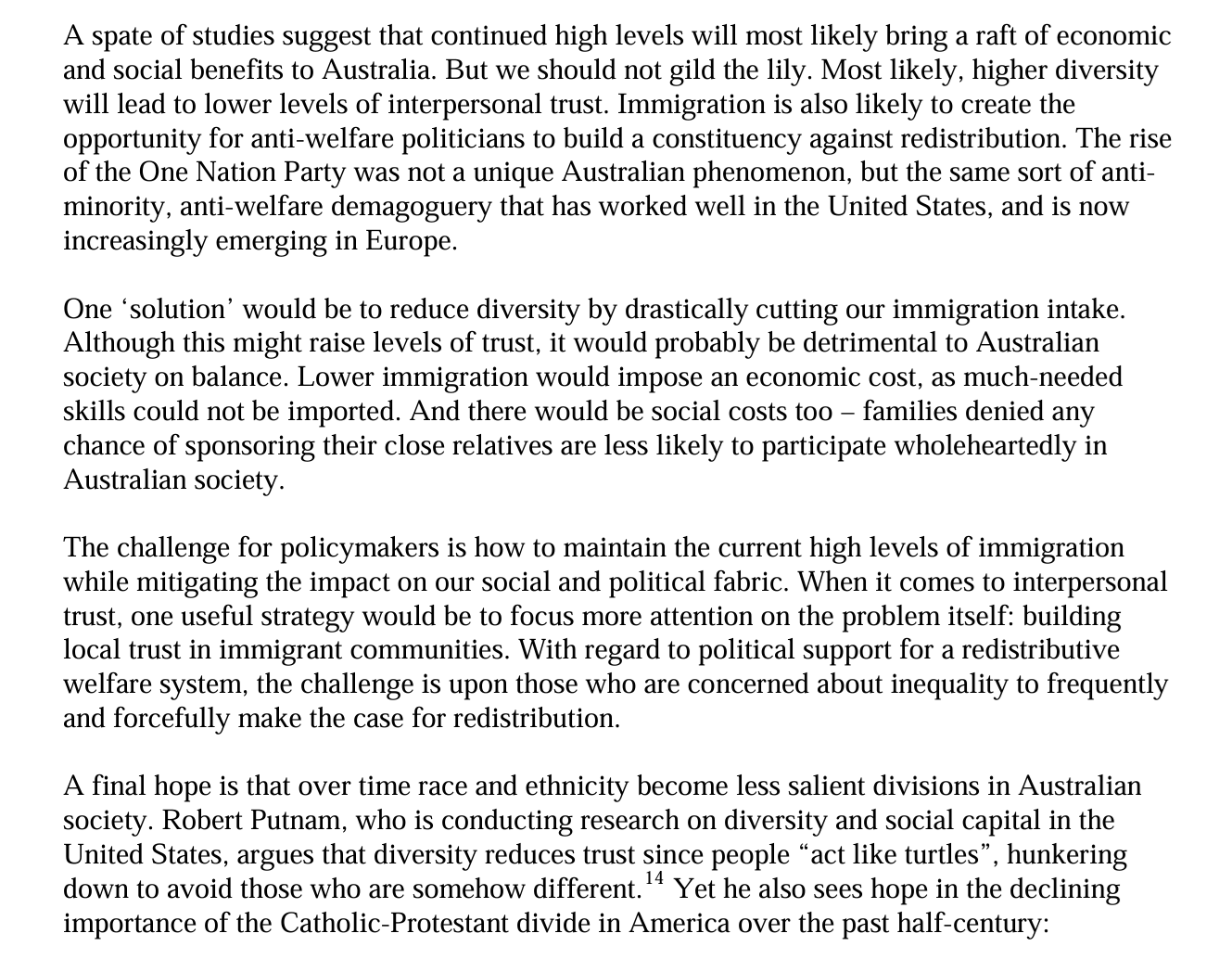 On trust, Leigh’s research closely echoed that of US academic Robert Putnam, who famously found that diversity reduces trust because people ‘hunker down’ to avoid those who are different. Leigh found that Australian survey data also showed a negative correlation between trust and ethnic diversity.