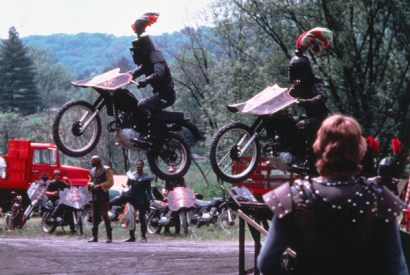 A knight and his lady awaken, naked in the forest. She pins up her embroidered gown while he begins his…