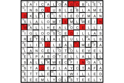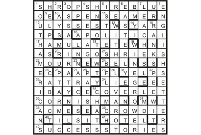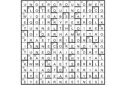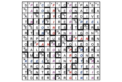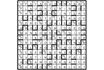 Twelve symmetrically disposed unclued entries comprise three pairs of Spoonerisms (an anagram of the title): POURING RAIN/ROARING PAIN, FRYING PAN/PRYING…
