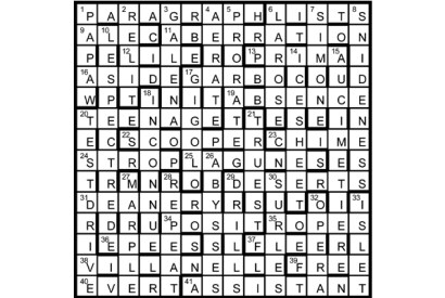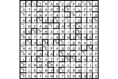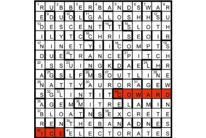 Seven identical two-by-two squares in the completed grid must be highlighted to depict the unclued entries, each of two words.…