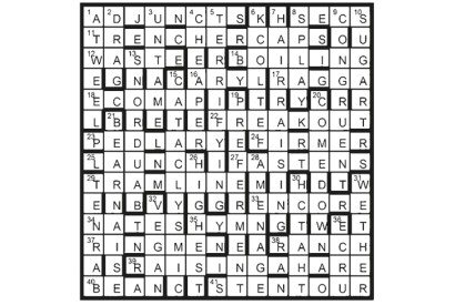 Answers to clues in italics are SET IN STONE (38). Resulting entries at 1, 2, 14, 25 and 43 (in…