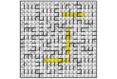 Three unclued lights form a nine-word quotation from a thematic work. Remaining unclued lights, including one hyphened, are five trios…