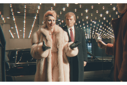 A middle-aged woman wearing what looks like Princess Diana’s infamous ‘revenge dress’ and a balaclava from an IRA funeral approaches…